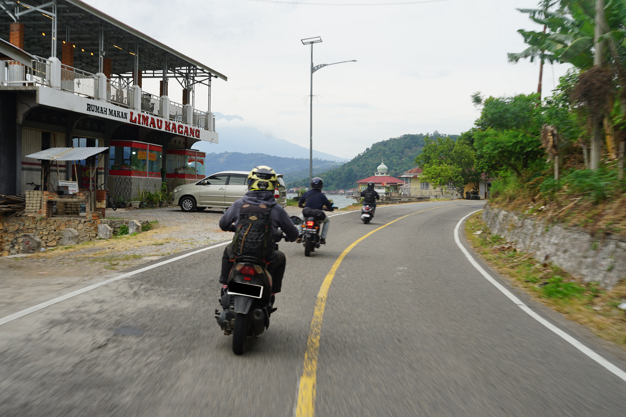 Dari sana, motor-motor kami mengarah keluar Pekanbaru menuju Bangkinang. Bukan tujuan utama, hanya titik jeda. Mesin dibiarkan mendingin, rokok dinyalakan satu dua batang, badan sedikit diluruskan. Tidak banyak obrolan penting—perjalanan panjang rasanya lebih masuk akal kalau tidak dimulai dengan terburu-buru.